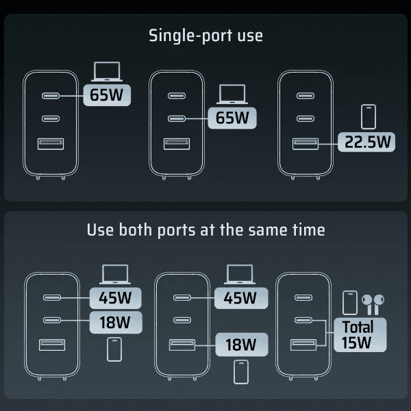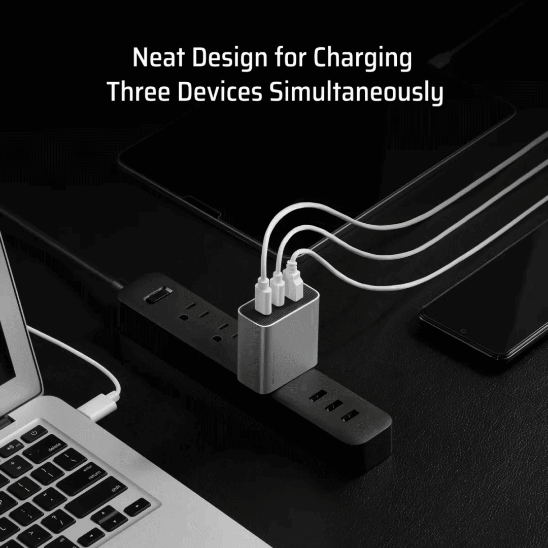 Với 3 cổng sạc đồng thời, người dùng có thể sạc cùng lúc laptop, điện thoại và tai nghe mà không cần dùng nhiều củ sạc khác nhau. Cổng USB-A hỗ trợ các chuẩn sạc nhanh cơ bản, phù hợp với các thiết bị cũ hoặc phụ kiện khác. Kết hợp linh hoạt giữa các cổng giúp phân bổ công suất tối ưu và duy trì hiệu suất ổn định khi sạc nhiều thiết bị cùng lúc.