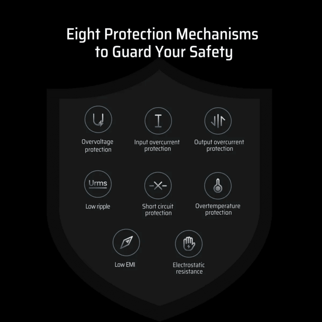 - An toàn tuyệt đối: Công nghệ GaN3 cùng 8 cơ chế bảo vệ bảo vệ thiết bị khỏi rủi ro điện áp.