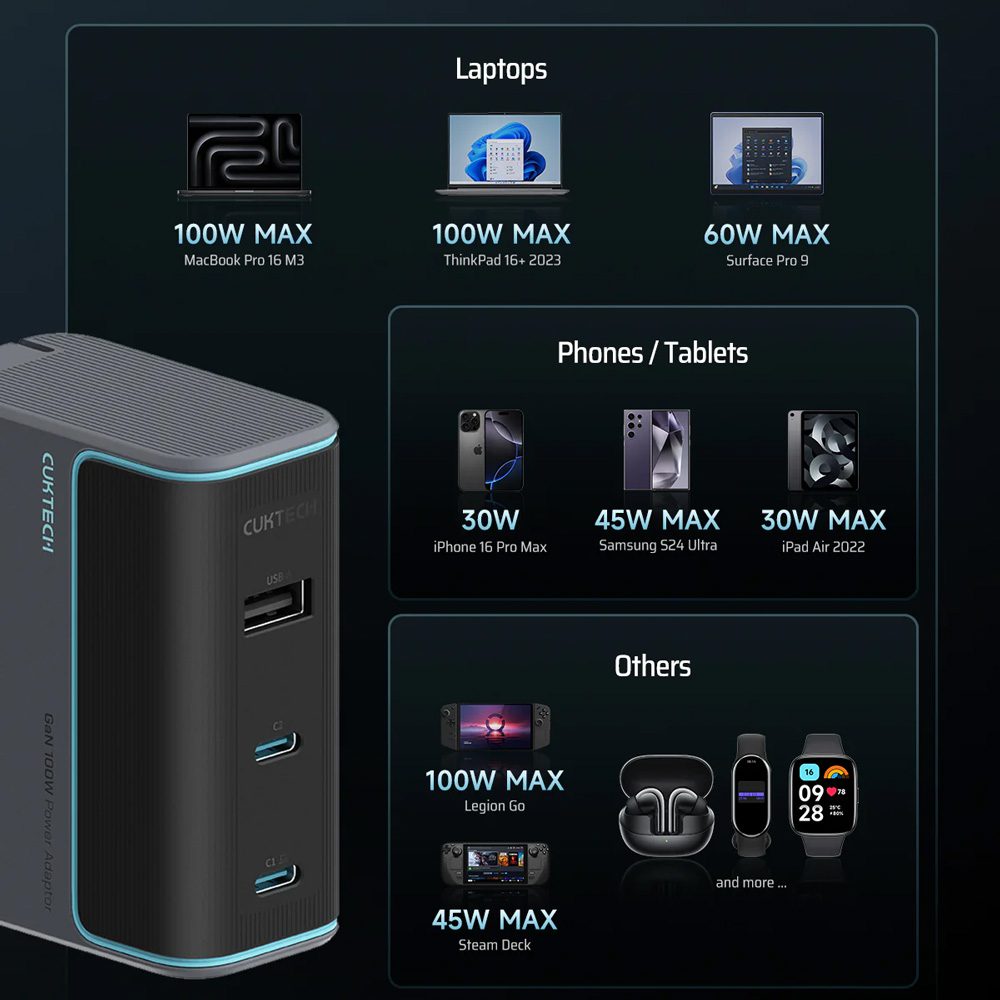 Với công suất tối đa 100W, CUKTECH AD1003CH có thể sạc đầy pin cho các thiết bị laptop như MacBook Pro, ThinkPad hay các dòng ultrabook trong thời gian ngắn. Ngoài ra, các thiết bị di động như iPhone, iPad, Samsung Galaxy, Google Pixel hay máy chơi game Nintendo Switch, Steam Deck cũng được sạc nhanh chóng, tiết kiệm tối đa thời gian chờ đợi.