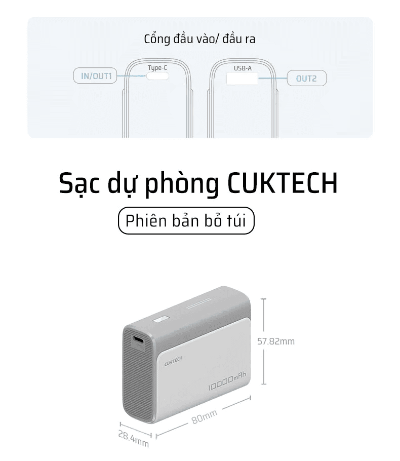 Với dung lượng 10000mAh, pin dự phòng này đủ để sạc iPhone khoảng 2–3 lần hoặc sạc đầy điện thoại Samsung 2 lần. Đây là mức dung lượng lý tưởng cho nhu cầu sử dụng di động hàng ngày, đảm bảo bạn luôn có nguồn năng lượng dự phòng khi cần. Ngoài ra, CUKTECH PB100 được tích hợp chip bảo vệ đa tầng, chống quá áp, quá nhiệt và quá dòng, giúp thiết bị và người dùng luôn an toàn trong suốt quá trình sạc.